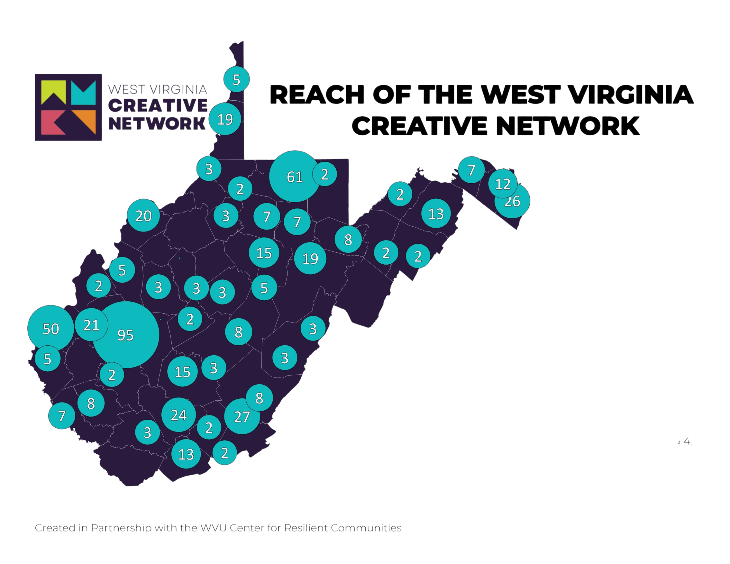 The reach of the West Virginia Creative Network holds strong within the state, with the presence of artists, members, and patrons spreading across 60+ counties.